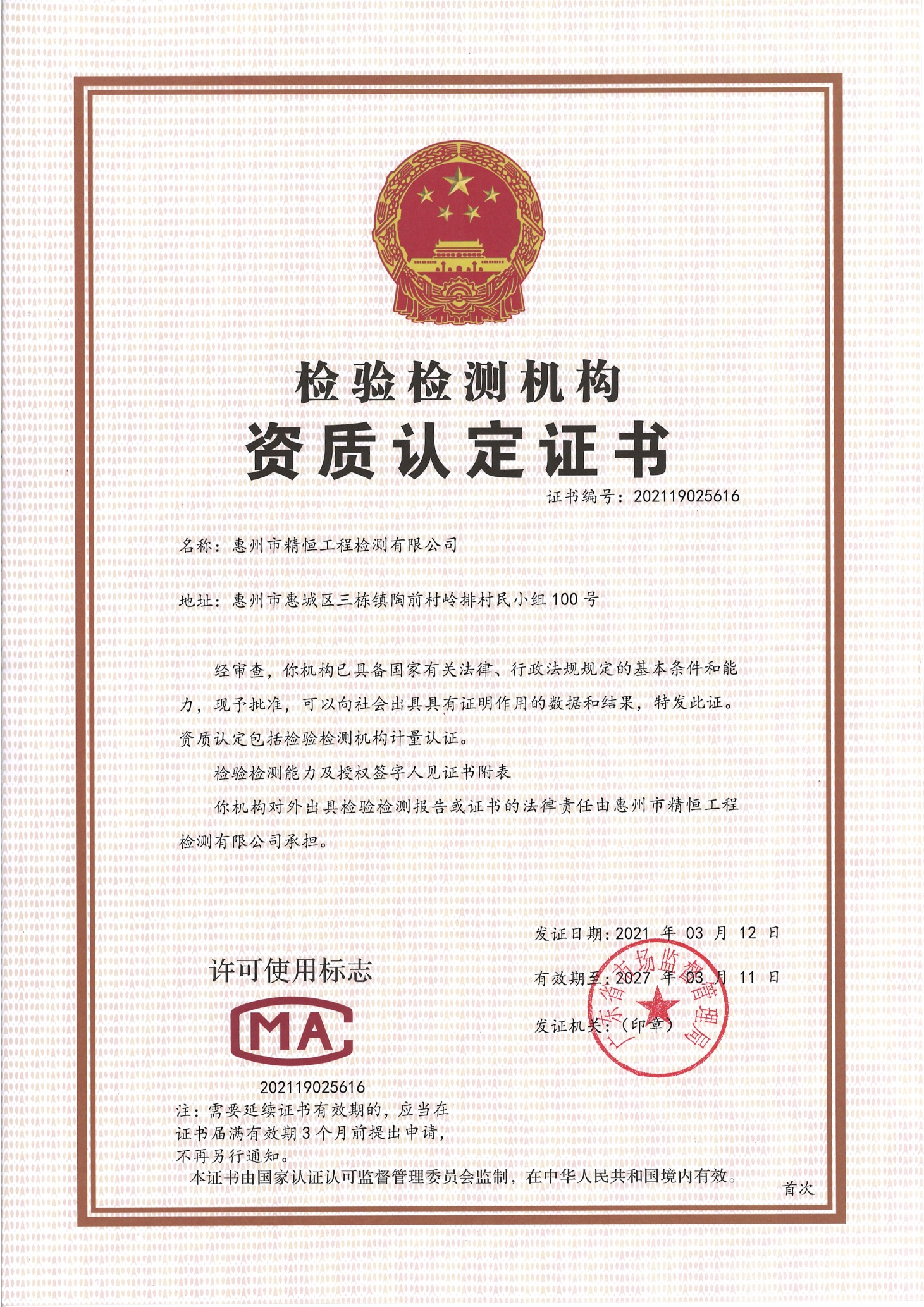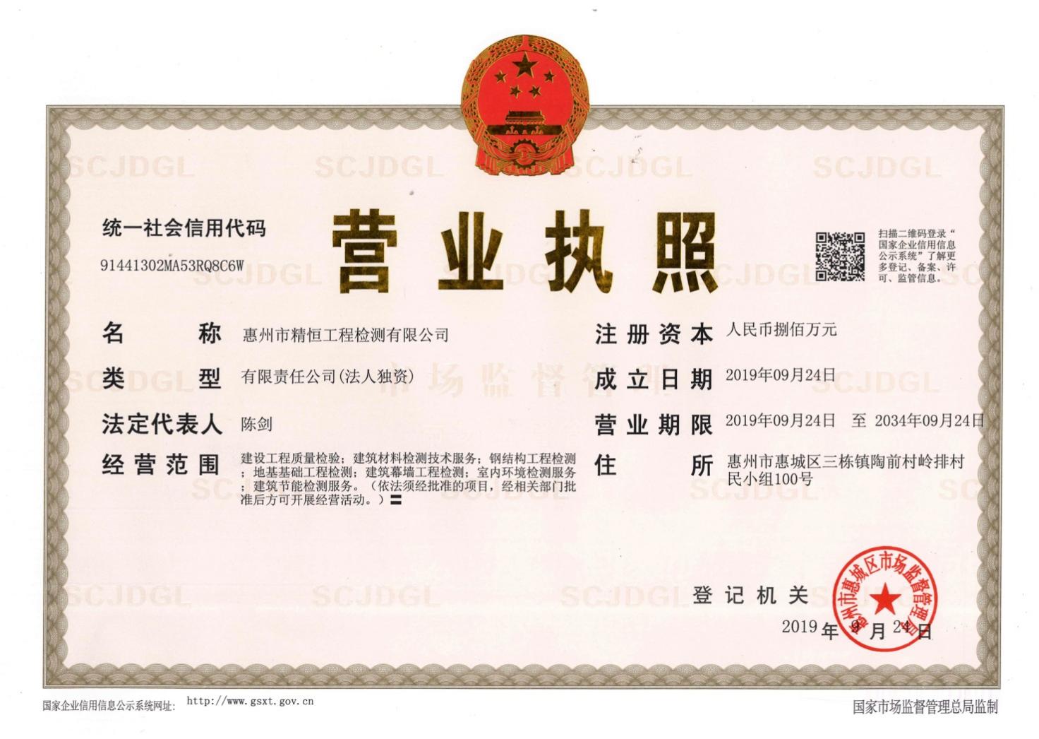 惠州市精恒工程检测有限公司是好博官网登录入口旗下的全资子公司,位于惠州市惠城区三栋镇陶前村岭排村民小组100号,成立于2019年9月24日,注册资本800万元,是一家专业从事第三方检测、具有独立法人资格的检验检测服务机构。