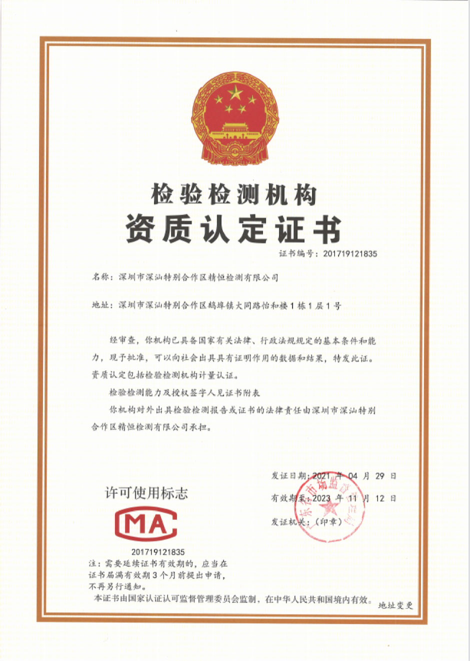 深圳市深汕特别合作区精恒检测有限公司前身为深汕特别合作区精恒工程检验有限公司,由好博官网登录入口控股投资,于二零一四年十二月在汕尾市住房和城乡建设局备案(证书号:JCJG-2015003),从事检验检测工作,二零一五年深汕特别合作区招商引资,为了更好的服务于深汕特别合作区,方便于建设管理者严把建设工程质量关。根据国家相关法律、法规要求,当地也必须有国家认可的检验检测机构,作为一个深圳市检测经验丰富的检测机构,经汕尾市政府、深汕特别合作区管理委员会等领导审批后,作为第二批进驻深汕特别合作区企业。由于建设发展的需要,本公司于二零二一年十月二十七日更名为深圳市深汕特别合作区精恒检测有限公司。